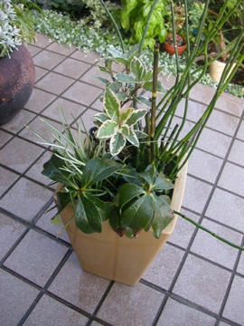 お次ぎは、手前がクリスマスローズ、時計回りにジャノヒゲ ハクリュウ
